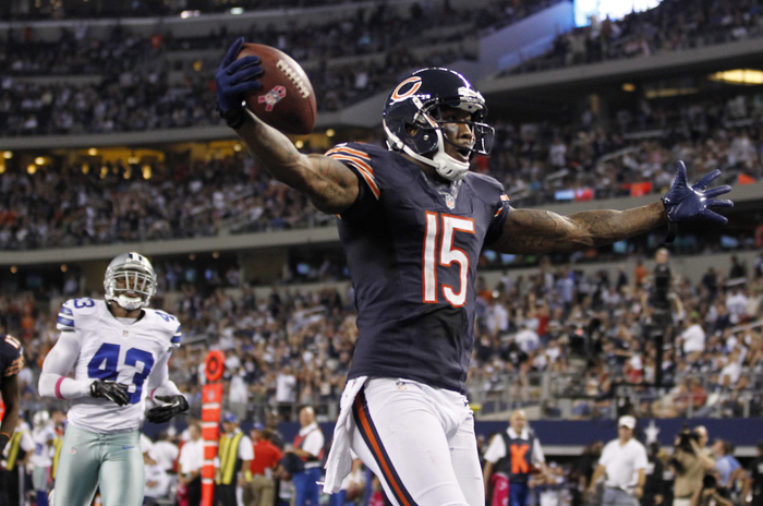 Chicago Bears wide receiver Brandon Marshall celebrates his touchdown reception as Dallas Cowboys safety Gerald Sensabaugh trails the play in the second half of their NFL football game in Arlington, Texas October 1, 2012. REUTERS/Mike Stone (UNITED STATES – Tags: SPORT FOOTBALL)